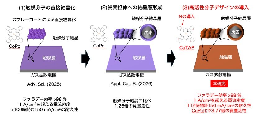 本研究では、CoTAPを用いることで98%以上の高効率でCO₂をCOに変換し、従来のCoPc触媒と比べて約3.8倍の質量活性を実現。身近な青色顔料をベースとした新たなCO₂変換触媒として、温暖化ガスを有用な化学原料に変える社会実装への道を大きく前進させる成果です。